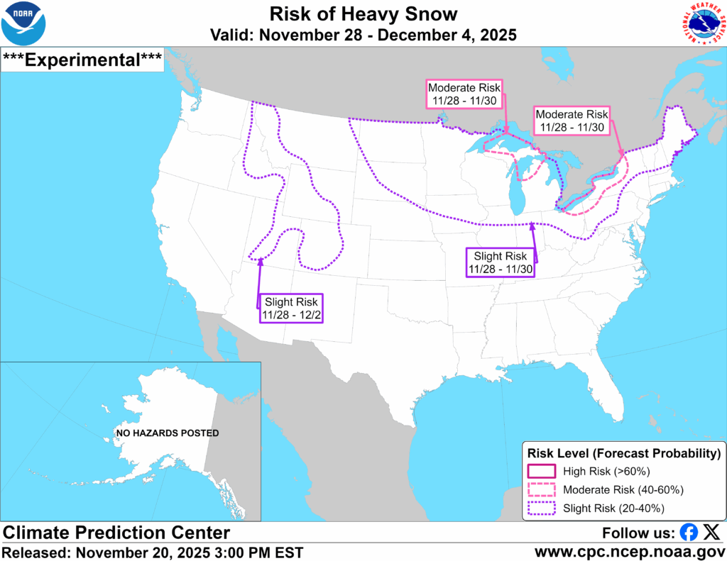The Climate Prediction Center (CPC) currently shows a 20–40% “slight risk” of heavy snow for parts of the Upper Midwest, including most of the northern half of Iowa, during this period.